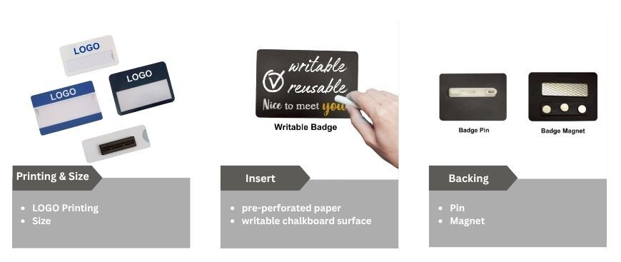 Поднимите свой бренд с помощью профессиональных решений для бейджей, настроенных в соответствии с вашими требованиями. Наши бейджи с вставками предлагают широкий выбор персонализации, идеально подходящей для корпоративного стиля, мероприятий или оптовых заказов, обеспечивая уникальный продукт, который действительно отражает ваш бренд.