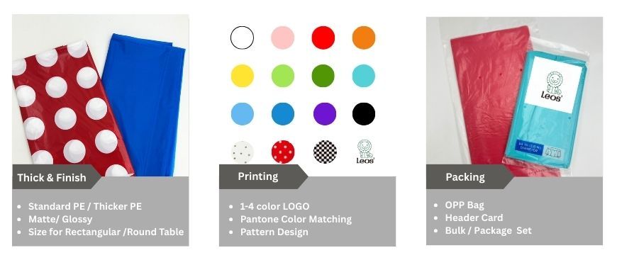Bìa bàn nhựa bán buôn tùy chỉnh Leos' được thiết kế cho những người mua số lượng lớn cần chất lượng đồng nhất và khả năng cung cấp đáng tin cậy. Được làm từ PE với kích thước tiêu chuẩn 52 x 108 inch, khăn trải bàn hình chữ nhật này phù hợp với các bàn dài lên đến 8 feet, cung cấp sự bảo vệ toàn diện chống lại các vết đổ trong các sự kiện, tiệc tùng, dịch vụ ăn uống, căng tin, khách sạn, công ty cho thuê và các chức năng doanh nghiệp.